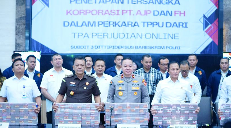 Jakarta, mediakpk.co.id – Direktorat Tindak Pidana Ekonomi Khusus (Dirtipideksus) Bareskrim Polri menetapkan korporasi PT AJP dan seorang individu berinisial FH sebagai tersangka dalam kasus Tindak Pidana Pencucian Uang (TPPU) yang berasal dari tindak pidana perjudian online. Penyidik juga berhasil menyita uang senilai Rp 103,27 miliar yang tersebar di 15 rekening bank.