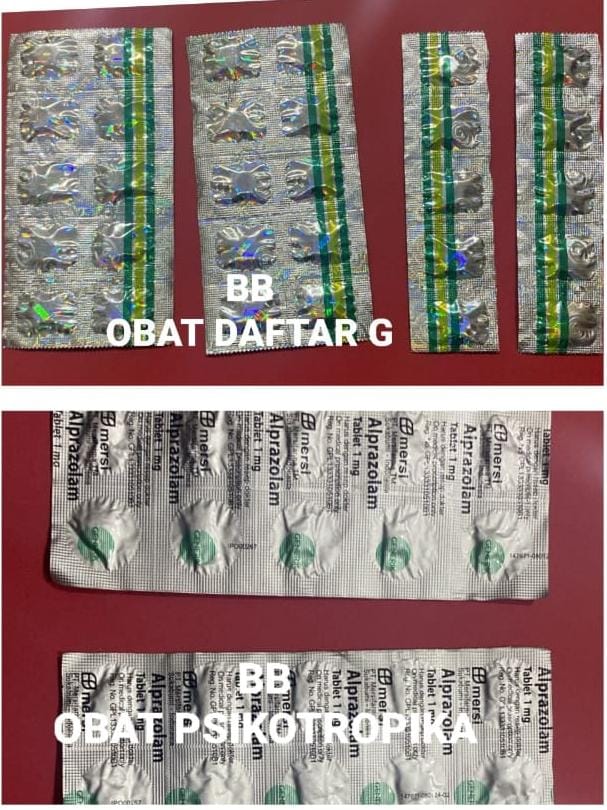 BANYUMAS, mediakpk.co.id -S -.Sat Resnarkoba Polresta Banyumas ungkap kasus tindak pidana barang siapa secara tanpa hak memiliki, menyimpan dan/atau membawa Psikotropika atau setiap orang yang tidak memiliki keahlian dan kewenangan tetapi melakukan praktik kefarmasian yang terkait dengan sediaan farmasi berupa obat keras sebagaimana dimaksud dalam pasal 62 Undang Undang RI. No. 5 tahun 1997 tentang Psikotropika atau pasal 436 ayat (2) Undang Undang RI No.17 tahun 2023 tentang Kesehatan.