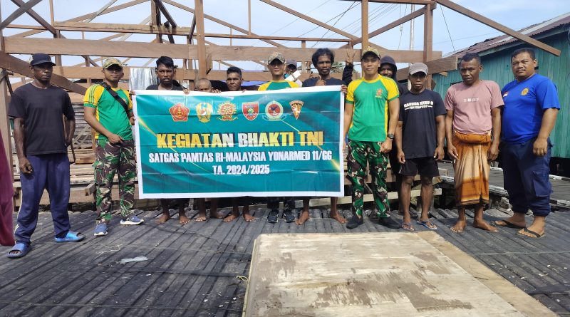 Nunukan, mediakpk.co.id – 01 Februari 2025 Satgas Pamtas Yonarmed 11 Kostrad Pos Sei Kaca kembali menunjukkan kepeduliannya terhadap masyarakat di perbatasan dengan menggelar kegiatan karya bhakti membantu pembangunan rumah milik Bapak Dedi di Kampung Pukat, Desa Sei Bolong, Kecamatan Nunukan Barat, Kabupaten Nunukan.