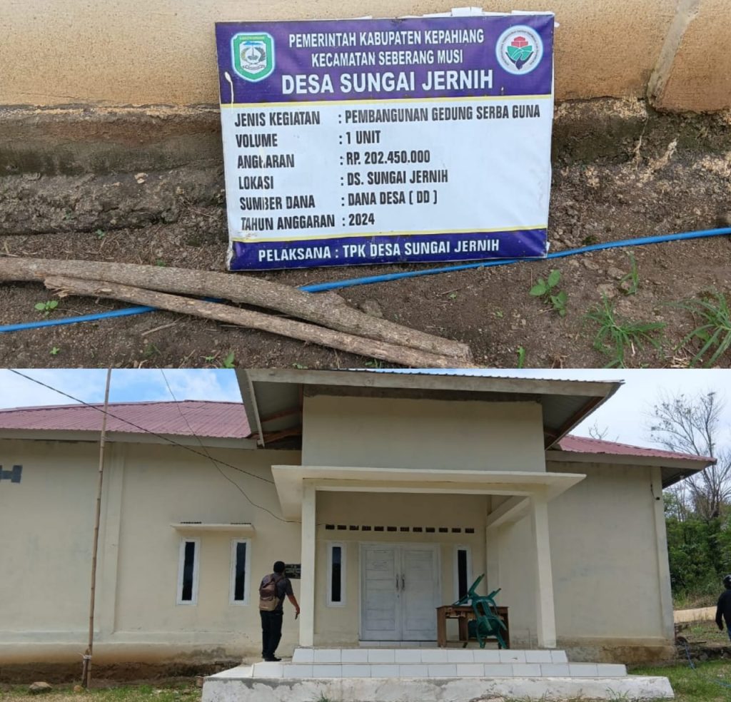 Thank you for reading this post, don't forget to subscribe!dijelaskan oleh salah satu perangkat Desa Sungai Jernih, bangunan fisik gedung serba guna tersebut dikerjakan dengan angka yang fantastis, yaitu menelan anggaran dana desa ( DD ) dengan total Rp. 400 juta lebih yang dikerjakan secara 2 ( dua ) tahap. yaitu tahap 1 ( satu ) pada tahun 2023 dengan anggaran Rp. 216 juta lebih yang dikerjakan oleh pihak ketiga dan diselesaikan di tahap 2 ( dua ) dengan anggaran Rp. 202.450.000,- ( dua ratus dua juta empat ratus lima puluh ribu rupiah ) dengan perkiraan luas bangunan 15 x 10 Meter persegi.