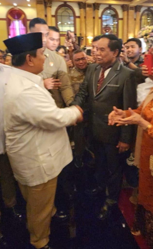Thank you for reading this post, don't forget to subscribe!Keakraban terlihat dari senyuman dan sapaan Presiden RI Jenderal Purn Prabowo Subianto terhadap Tatang Zaenudin saat menghadiri undangan pernikahan putra dari Letjen TNI Djaka Budhi Utama di balai samudera kelapa gading Jakarta, Sabtu (15/2/2025).