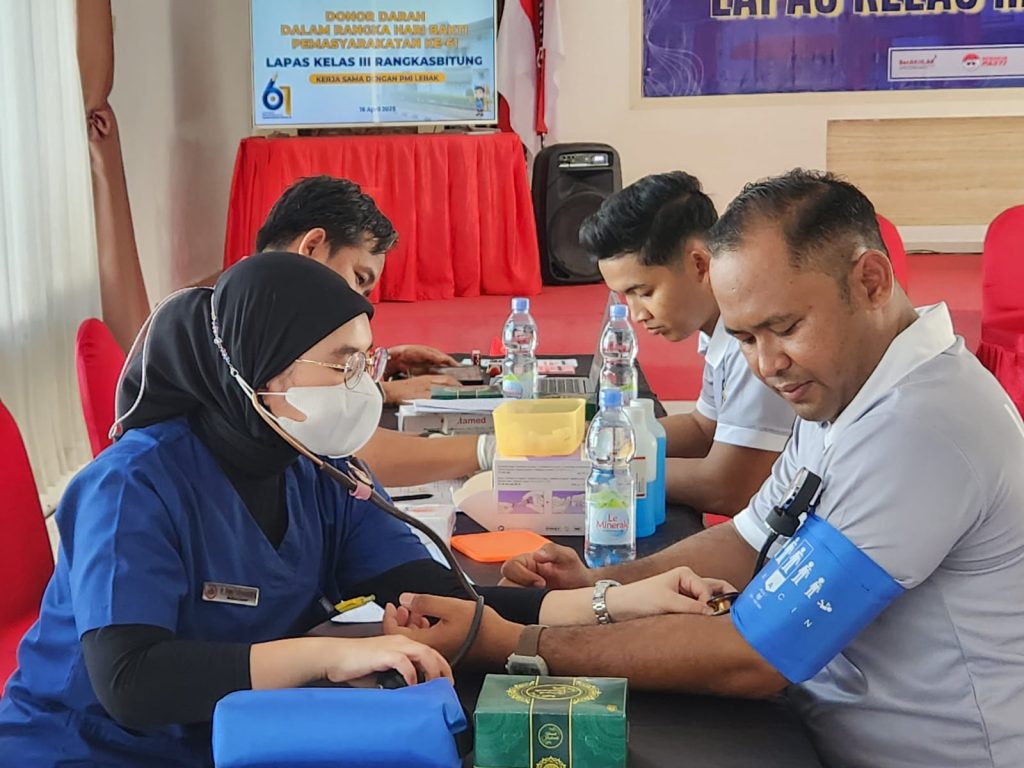 Rangkasbitung, mediakpk.co.id – INFO PAS, Lembaga Pemasyarakatan (Lapas) kelas III Rangkasbitung bekerjasama dengan PMI Kabupaten Lebak menggelar kegiatan donor darah yang diikuti oleh jajaran pegawai Lapas Rangkasbitung, kegiatan tersebut dalam rangka menyambut Hari Bakti Pemasyarakatan Ke-61 Tahun 2025, Rabu (16/04/2025)