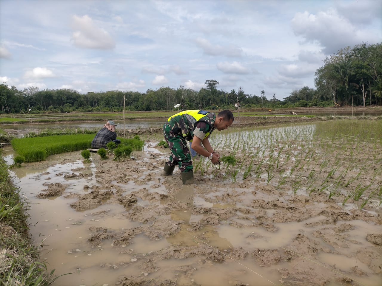 Dukung Ketahanan Pangan, Babinsa Koramil 02/Karang Baru Bantu Petani Tanam Padi