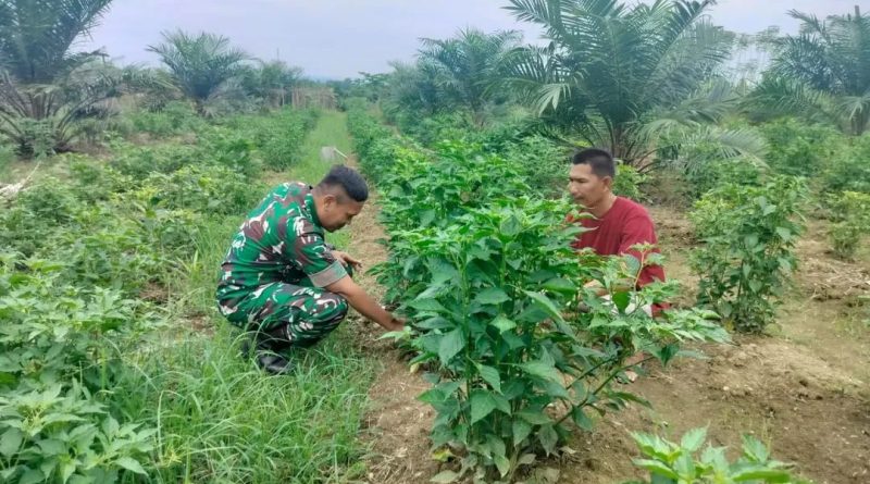 Bintara Pembina Desa (Babinsa) Koramil 06/Manyak Payed jajaran Kodim 0117/Aceh Tamiang, Sertu Robi Robani membantu perawatan tanaman cabe di wilayah Desa binaannya diatas lahan milik Bapak Yusra, anggota Kelompok Tani Ingin Maju Desa Matang Ara Jawa, Kecamatan Manyak Payed, Minggu (04/05/25)