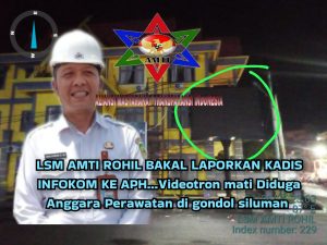–LSM AMTI Rohil Bakal laporkan kadis Kominfotik Rohil, ke polda Riau terkait pengadaan dua unit Videotron Di duga rusak tidak terawat dan Mark up Polda Riau Segera memperiksa kadis Kominfo terkait Anggara yang di gunakan dari dana APBD Rohil. Pak Bupati H. Bistanam dan oak wakil Joni Carles jangan tutup mata, kalau gag ada ketegasan pak bupati dan wakil Bupati Rokan Hilir, kami menganggap bapak gagal menjadi pemimpin Rokan hilir.