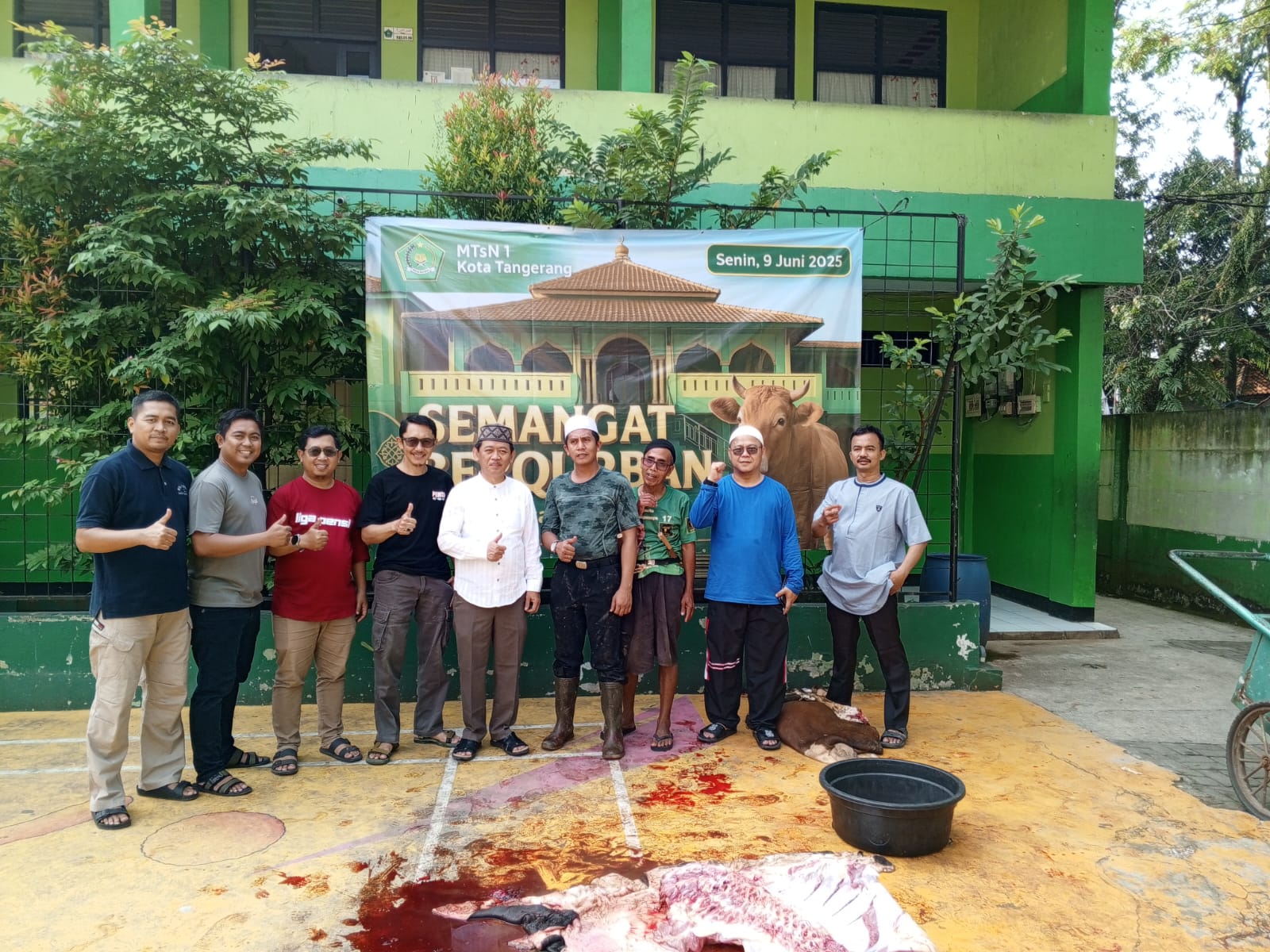 Melaksanakan kegiatan menyembelih hewan qurban di lapangan sekolahan, senin (9/6/25) kegiatan ini manifestasi sebagai bentuk kepedulian dan solidaritas komunitas pendidikan MTSN 1 kota Tangerang antar sesama Warga sekitar sekaligus pembelajaran siswa / siswi MTSN 1 kota Tangerang.