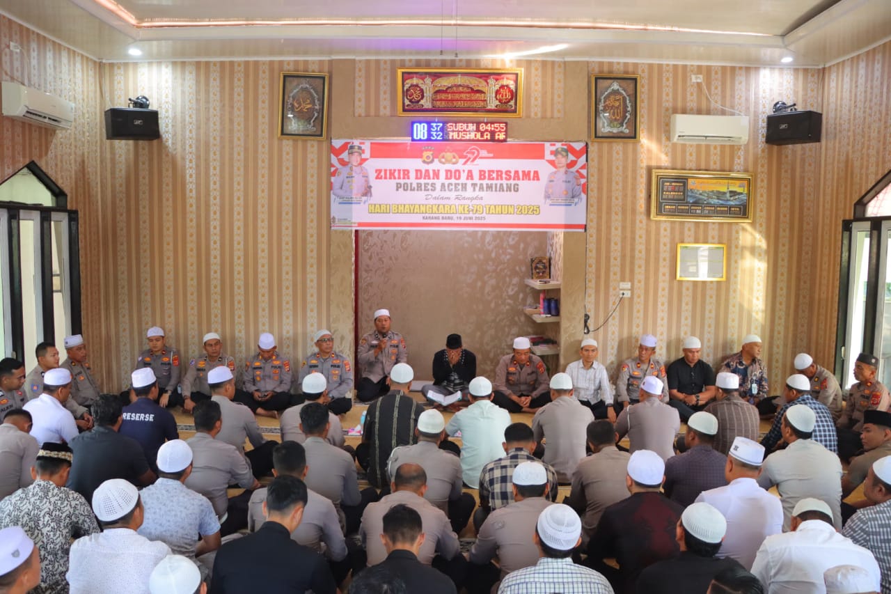 Polres Aceh Tamiang menggelar zikir dan doa bersama dalam rangka memperingati Hari Bhayangkara Ke-79 Tahun 2025 di Mushola Ar-Rahman Mapolres Aceh Tamiang, pada Kamis (19/6/25). Acara ini dihadiri oleh Wakapolres Aceh Tamiang, Pejabat Utama, dan personel Polres Aceh Tamiang.