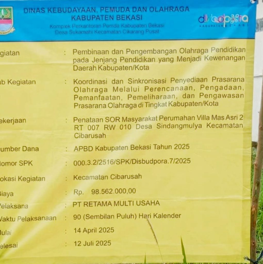 Diketahui, proyek Dispora Kabupaten Bekasi telah dianggarkan sebesar Rp.98.562.000 dari anggaran APBD 2025.