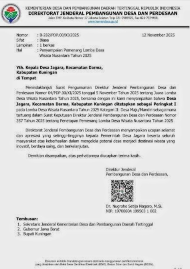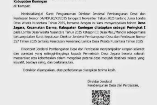 Pengumuman pemenang Juara I Desa Jagara sebagai Desa Wisata Nusantara 2025 kategori Desa Maju Mandiri ini, sesuai Surat Dirjen Pembangunan Desa dan Pedesaan, Kemendes dan Pembangunan Desa Tertinggal RI Nomor B-282/PDP.00/XI/2025.