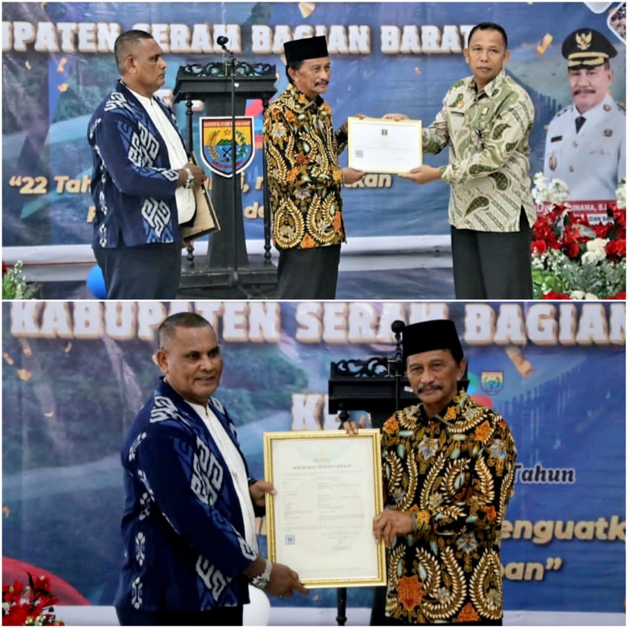 Berita Menarik ;Bupati Asri Arman Menyerahkan Dua Sertifikat Kemenhum RI Wil Maluku Kepada Azis Sillouw Ka.Balitbangda SBB