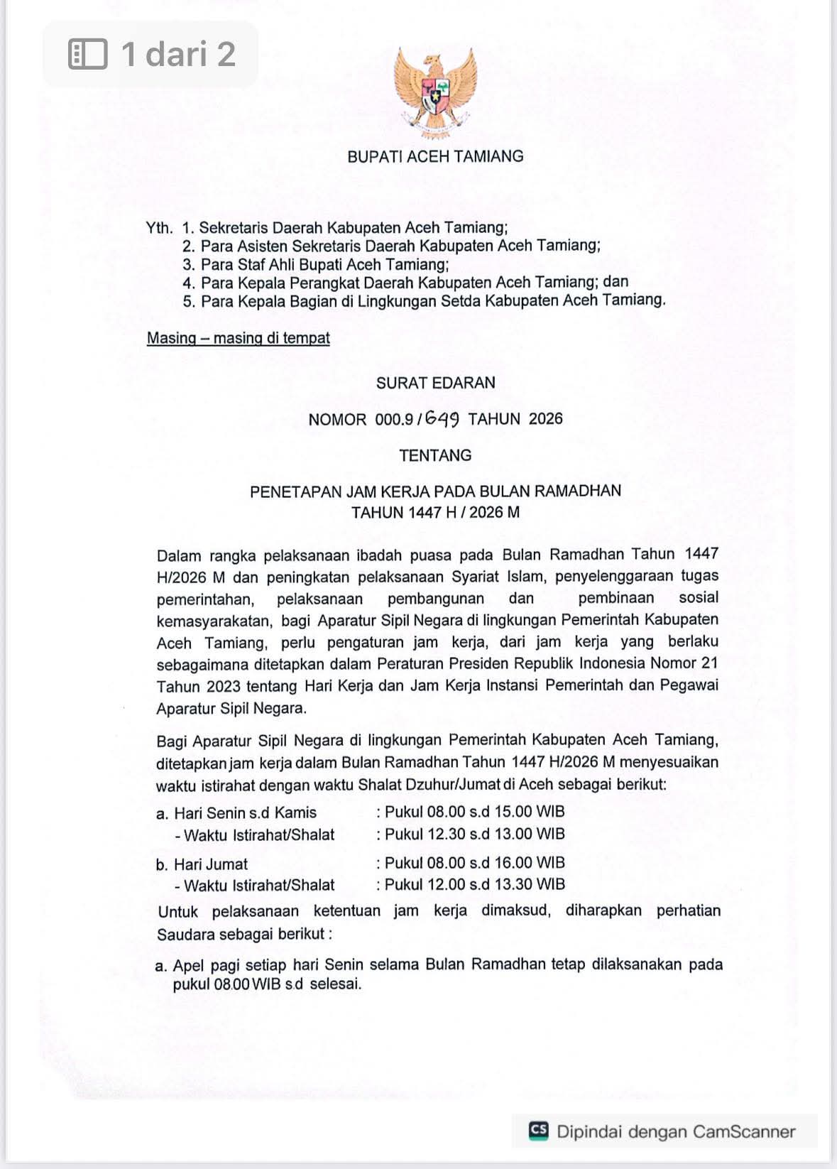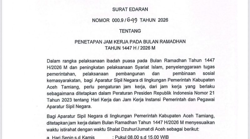 Dalam rangka efektivitas pelaksanaan kinerja Aparatur Sipil Negara (ASN) pada bulan Ramadhan 1447H dan meningkatkan pelaksanaan Syariat Islam pada 18 Februari 2026, Bupati Aceh Tamiang, Irjen Pol. (P) Drs. Armia Pahmi, MH telah menandatangani Surat Edaran (SE) Nomor: 000.9/649 Tahun 2026 tentang Penetapan Jam Kerja Pada Bulan Ramadhan 1447H.