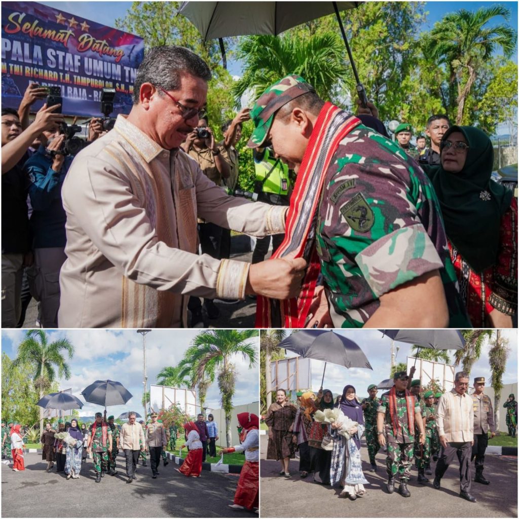 Setibanya di VIP Room Bandara Pattimura, suasana seketika berubah meriah sekaligus sakral. Gubernur Maluku, Hendrik Lewerissa, menyambut langsung Sang Jenderal Petarung dengan prosesi pengalungan kain tenun khas Maluku sebagai simbol penghormatan tertinggi dan ikatan persaudaraan yang abadi. Kemeriahan semakin memuncak saat tarian Lenso dari anggota Persit Yonif 733 dan dentuman musik Totobuang dari Sanggar Wairanang Negeri Soya mengiringi langkah Sang Panglima baru.