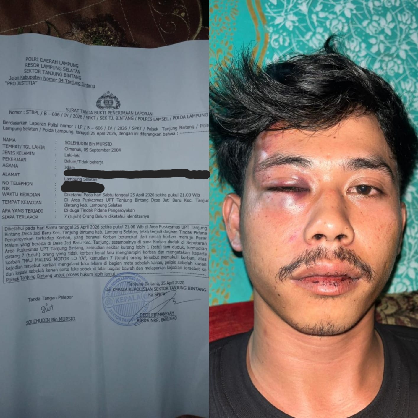 Tak terima atas penganiayaan dan fitnah yang mencemarkan nama baiknya, Solehudin resmi melaporkan kejadian ini ke Polsek Tanjung Bintang dengan nomor laporan : STBPL/B-606/IV/2026/SPKT/SEK TJ. BINTANG/POLRES LAMSEL/POLDA LAMPUNG.