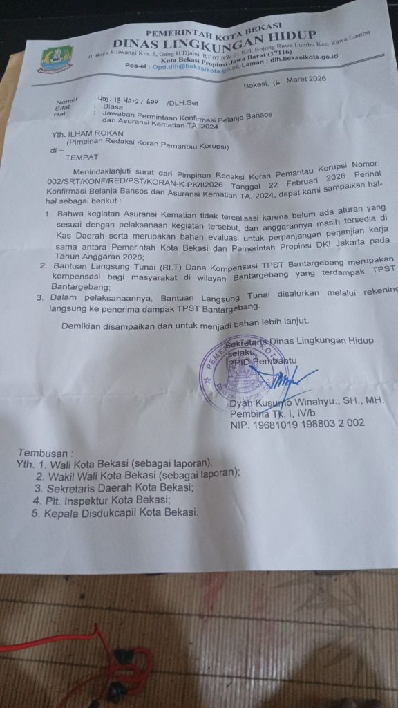 Adapun isi materi surat jawaban yang disampaikan oleh Pejabat DLH dana kegiatan Tahun 2024 masih tersedia dikas daerah dikarenakan belum adanya paying hukum yang mengikat anehnya ditahun berikutnya tahun 2025 pihak LH Kembali merealisasikan kegiatan yang sama dengan nama kegiatan: Belanja Iuran Jaminan Kematian Non ASN Kegiatan Pertanggungan Kematian (Polis) Bagi Warga Yang Terdampak TPST Bantargebang (BKK DKI Jakarta – Luncuran TA. 2023).Kode RUP:61437006.Tahun Anggaran:2025.Lokasi Pekerjaan:Kecamatan Bantargebang.Volume Pekerjaan:1 (satu) Paket.Uraian Pekerjaan:Belanja Iuran Jaminan Kematian Non ASN Kegiatan Pertanggungan Kematian (Polis) Bagi Warga Yang Terdampak TPST Bantargebang (BKK DKI Jakarta – Luncuran TA. 2023)- Kel. Bantargebang : 19.044 Orang- Kel. Ciketing Udik : 19.737 Orang- Kel. Cikiwul : 22.398 Orang- Kel. Sumurbatu : 19.191 Orang.Sumber Dana:APBD-P 2025 Kota Bekasi.MAK:2.11.11.2.01.0004.5.1.02.02.02.0007..Total Pagu:9.877.473.000.Metode Pemilihan:Tender dan nama kegiatan: Belanja Iuran Jaminan Kematian bagi Non ASN Keg. Pertanggungan Kematian (POLIS) bagi warga yang terdampak TPST Bantargebang (BKK DKI JAKARTA – LUNCURAN TA 2022).Kode RUP:61434272.Tahun Anggaran:2025.Volume Pekerjaan:1 (satu) paket.Uraian Pekerjaan:Belanja Iuran Jaminan Kematian bagi Non ASN Keg. Pertanggungan Kematian (POLIS) bagi warga yang terdampak TPST Bantargebang (BKK DKI JAKARTA – LUNCURAN TA 2022)- Kel. Bantargebang : 19.003 orang- Kel. Ciketing Udik : 20.336 orang- Kel. Cikiwul : 22.147 orang- Kel. Sumurbatu : 20.097 orangSumber Dana:APBD-P 2025 Kota Bekasi.MAK:2.11.11.2.01.0004.5.1.02.02.02.0007.Total Pagu:4.389.693.000. Metode Pemilihan:Tender.Total dana anggaran kedua kegiatan Tahun 2025 Rp.14.267.166.000.