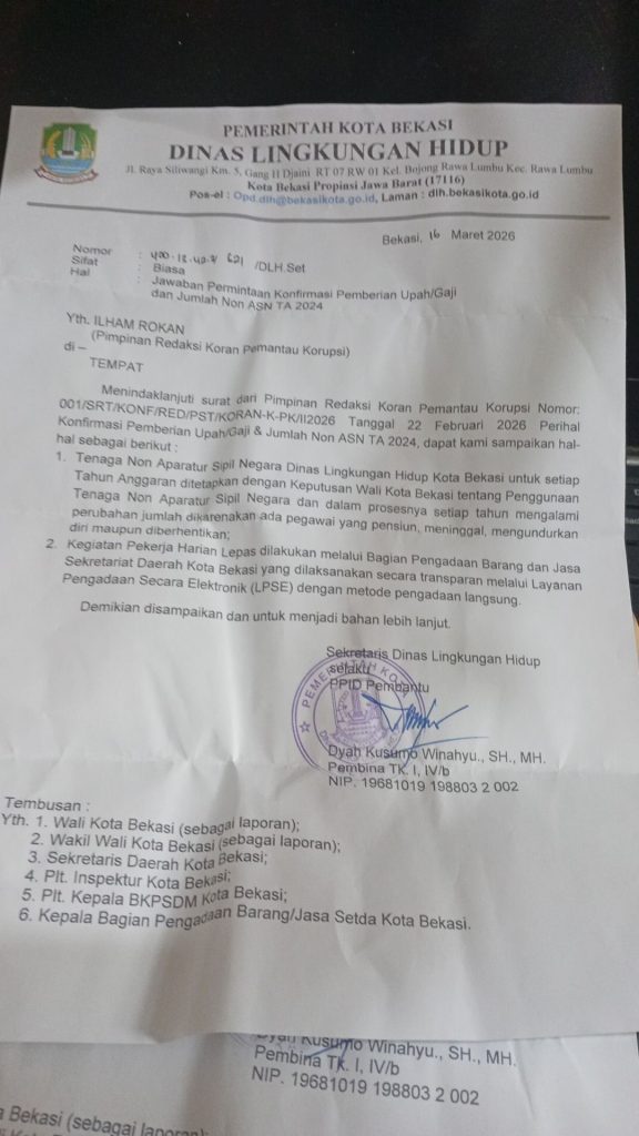 Berdasarkan data yang dimiliki Redaksi Kora Pemantau Korupsi Dinas Lingkungan Hidup Kota Bekasi Tahun 2024 mengelola dana APBD Kota Bekasi Rp.456.014.000.000.