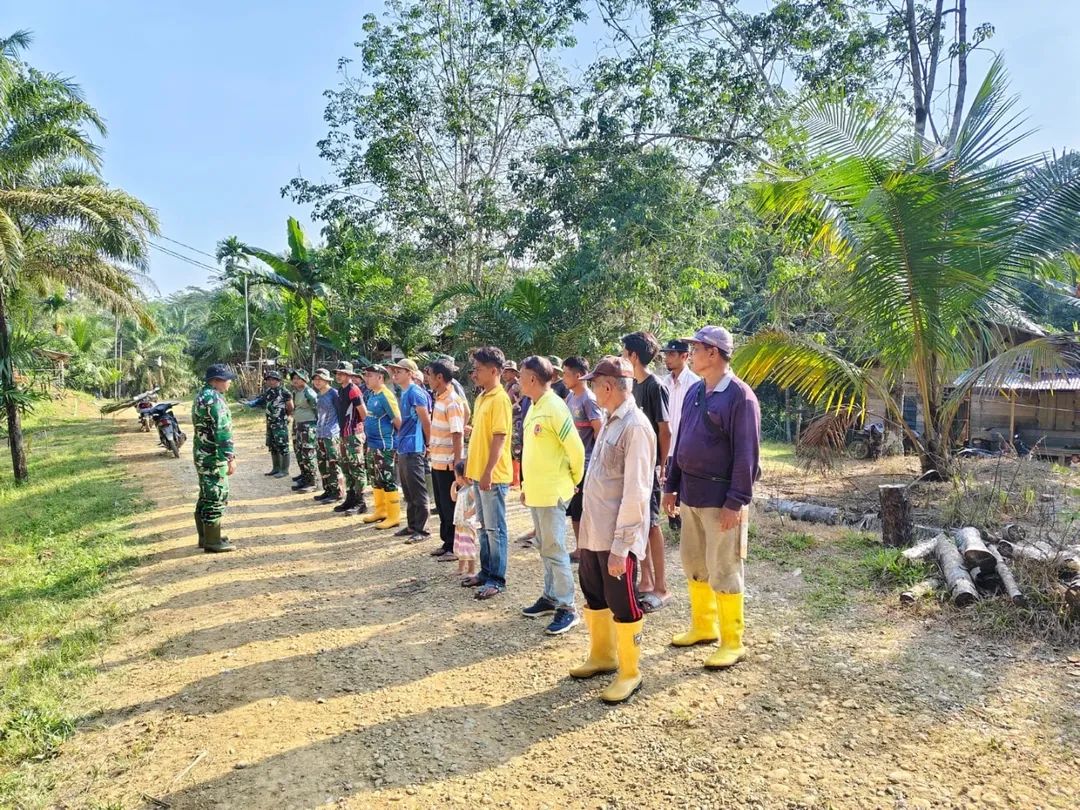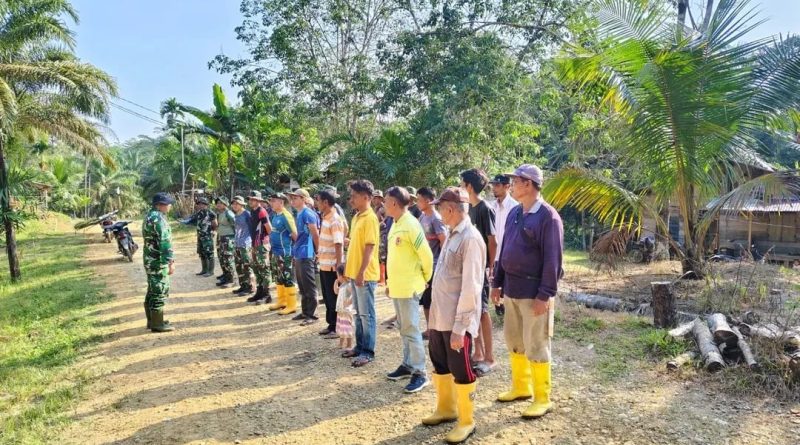 Puluhan personil satgas TMMD Reguler Ke-128 bersama masyarakat melaksanakan rutinitas apel pagi sebelum melaksanakan kembali tugas pengerjaan sasaran fisik pembuatan jalan di Desa Suka Makmur, Kecamatan Sekerak, Kabupaten Aceh Tamiang. Kamis (23/04/2026)