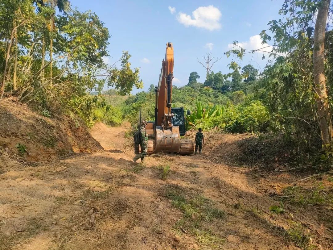 Personel Satgas TMMD Reguler Ke-128 Kodim 0117/Aceh Tamiang mengawasi serta mengarahkan operator alat berat excavator trobos hutan menjadi jalan yang bisa dilalui, dalam pengerjaan pembukaan/perbaikan Jalan sepanjang 12 KM dan lebar 6 Meter bertempat Di Dusun Jaya, Desa Suka Makmur, Kecamatan Sekerak, Kabupaten Aceh Tamiang, Kamis (23/04/2026)